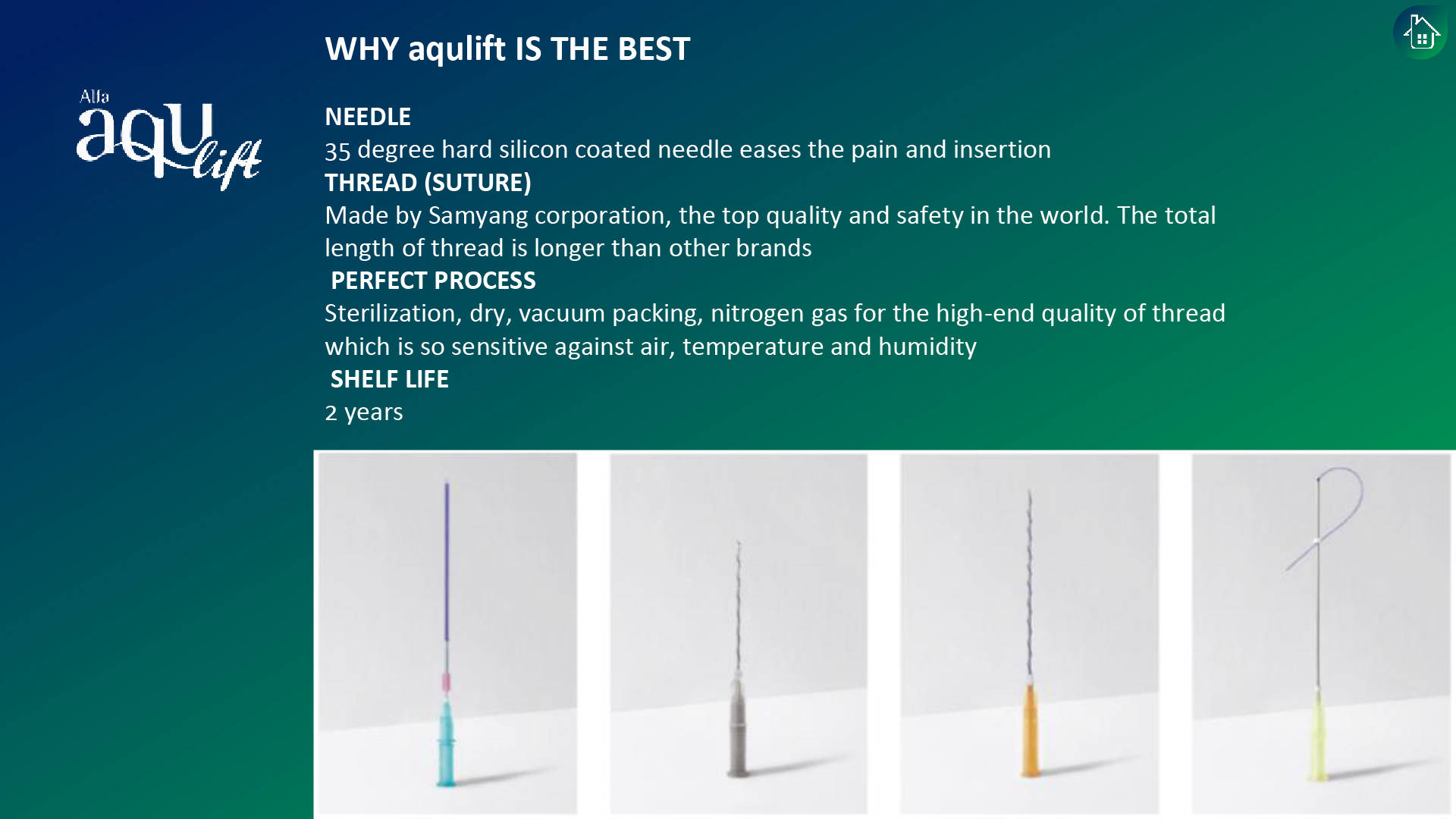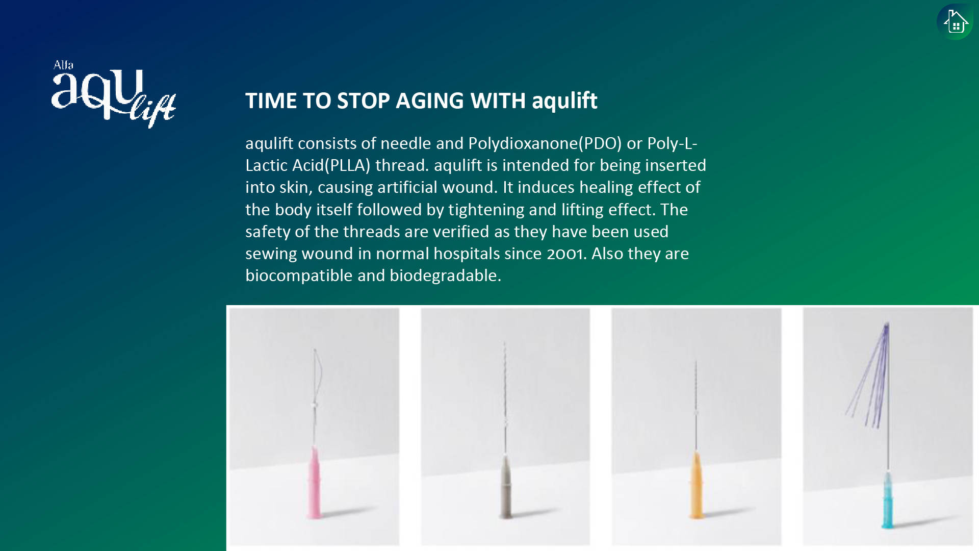 aqulift consists of needle and Polydioxanone(PDO) or Poly-L-Lactic Acid(PLLA) thread. aqulift is intended for being inserted into skin, causing artificial wound. It induces healing effect of the body itself followed by tightening and lifting effect. The safety of the threads are verified as they have been used sewing wound in normal hospitals since 2001. Also they are biocompatible and biodegradable.