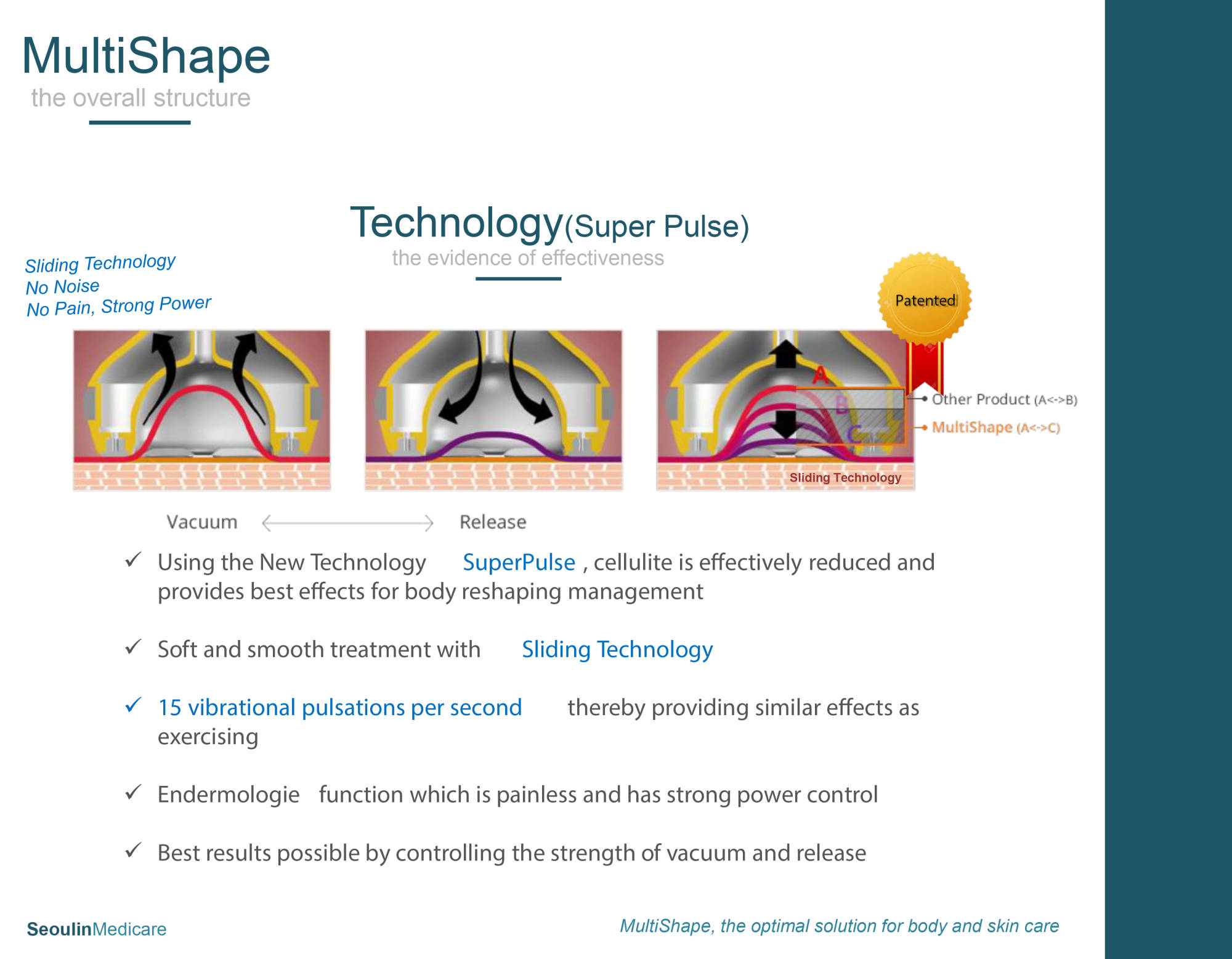 • Using the new technology super pulse from the vacuum, the best result are achieved for cellulite reduction and body reshaping management.